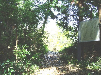 城址の入口である。通りから引っ込んだ位置に看板があるため見落としやすい。入口に立つ案内石碑